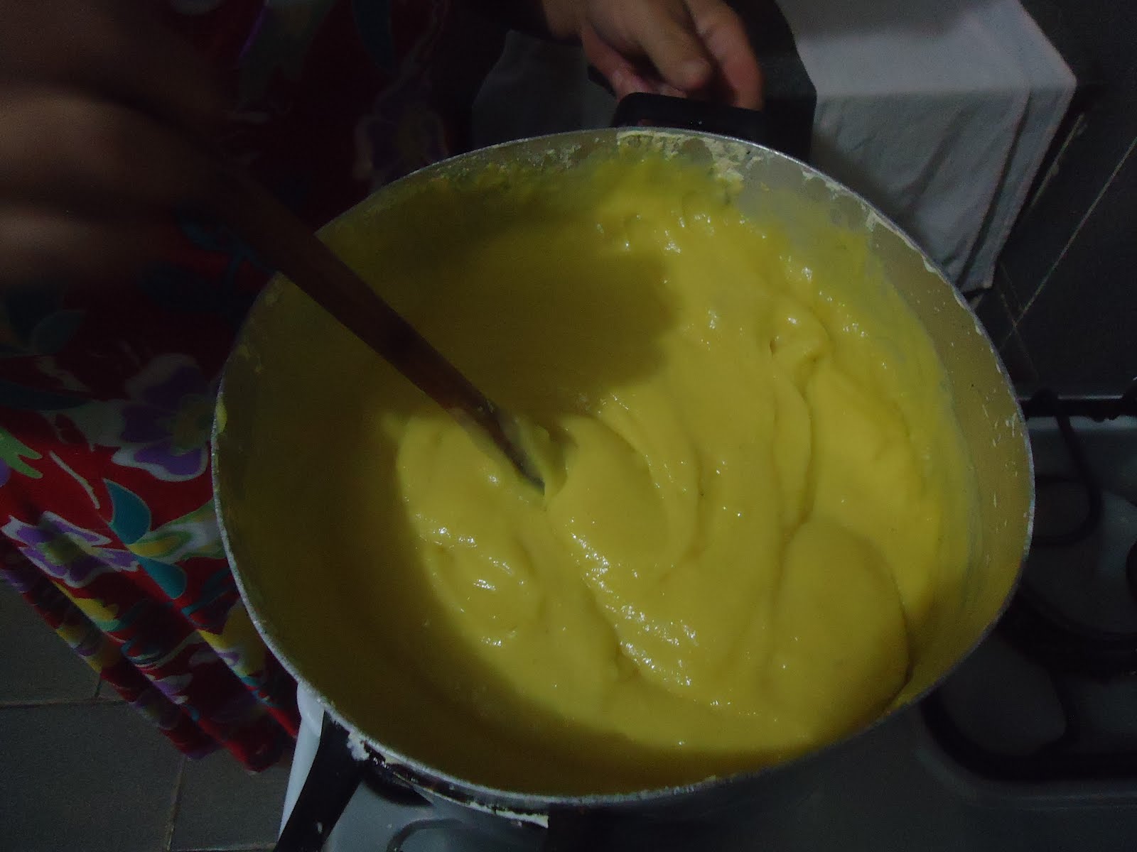 Levar ao fogo numa panela o caldo com açúcar, pitada de sal e manteiga, e mexer sem parar até engrossar.
